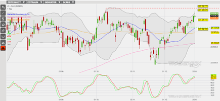 Charttechnisch hat der DAX am 18. Dezember bei 23.918 Punkten ein markantes Verlaufstief im Chart etabliert. Anschließend konnte der Index an den letzten sechs Handelstagen bereits täglich höhere Hochs und Tiefs ausbilden. Diese bullishe Tendenz hat die Kursentwicklung bis zum oberen Bollinger-Band geführt. Sollte eine temporär überkaufte Situation durch das Überschreiten des oberen Bollinger-Bandes eintreten, dann könnte dies die Basis für eine technische Gegenreaktion legen. Schwächetendenzen könnten in diesem Szenario dazu beitragen, dass die Slow Stochastik wieder ein Verkaufssignal triggert. Der Oszillator weist ein Verkaufssignal aus, sobald die grüne Signallinie der Slow Stochastik unter die rote Signallinie sinkt.