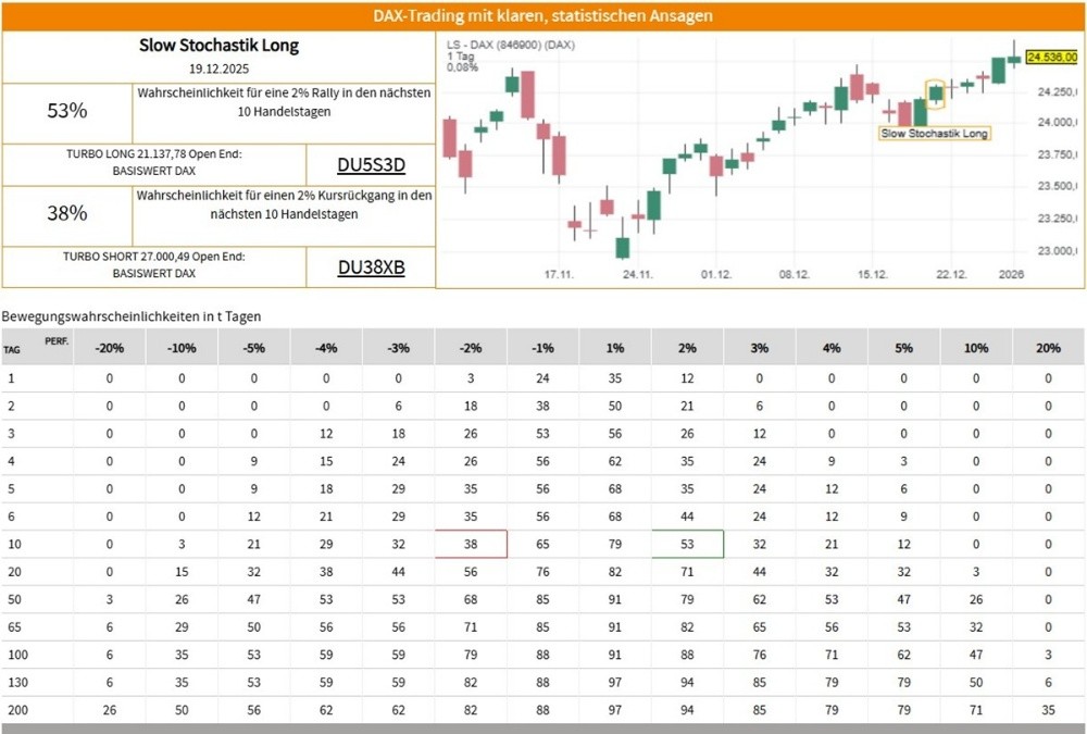 Die Erfolgswahrscheinlichkeiten für das Signal "Slow Stochastik Long" beruhen auf einer historischen Auswertung des Signals auf den LS-DAX im Zeitraum vom 02.01.2000 bis zum 02.01.2026. Dabei wurden die folgenden Voreinstellungen und Filter vorgenommen:
