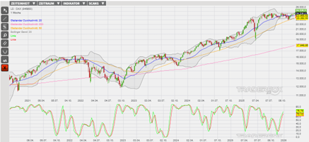 Der DAX befindet sich in einem langfristigen Aufwärtstrend, welcher im Oktober 2025 ein Allzeithoch markieren konnte. Es folgte eine Konsolidierung, welche am 21. November in einem markanten Verlaufstief gemündet ist. Anschließend wurde eine Trendfortsetzung eingeleitet, wobei der Index bis zum 12. Dezember temporär bis in den überkauften Bereich über das obere Bollinger-Band steigen konnte. Es folgte eine technische Gegenreaktion bis zum gleitenden Durchschnitt der letzten 50 Börsentage (= GD 50). Ausgehend vom Verlaufstief am 18. Dezember wurde dann wiederum eine Trendfortsetzung eingeleitet, welche bereits an den letzten sechs Handelstagen in Folge täglich steigende Hochs und Tiefs ermöglicht hat. Bestätigend für die Trendfortsetzung fungieren auch die sich ausweitenden Bollinger-Bänder sowie die intakten Kaufsignale in der Slow Stochastik und durch die gleitenden Durchschnitte der letzten 20, 50 und 200 Börsentage (GD 20, GD 50 und GD 200).