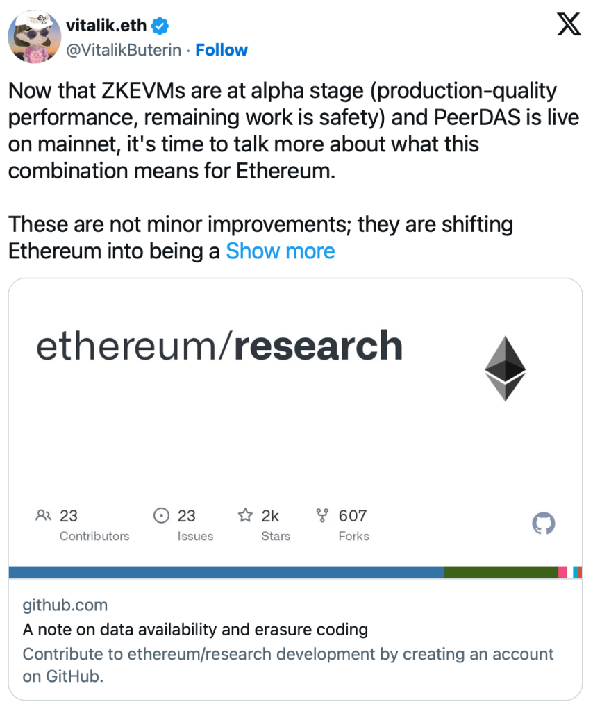 Ethereum steht nach Ansicht seines Mitgründers Vitalik Buterin vor einem grundlegenden technologischen Wandel. In einem aktuellen Beitrag erläutert er, warum die Kombination aus PeerDAS und zkEVMs weit mehr als ein gewöhnliches Upgrade ist und das Netzwerk in eine neue Liga dezentraler Systeme heben könnte.