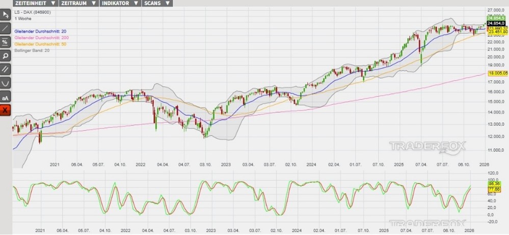 Der DAX befindet sich in einem langfristigen Aufwärtstrend. Insbesondere seit der Kursstabilisierung vom 18. Dezember im Bereich des gleitenden Durchschnitts der letzten 50 Börsentage (= GD 50) konnte der Index eine neue Aufwärtsdynamik entfalten. Seither ist der Index an sieben Tagen hintereinander mit täglich steigenden Hochs und Tiefs gestiegen. Obendrein wurde am 05. Januar nach einem Gap-Up ein weiterer Kursanstieg bis auf neue Höchststände bei 24.870 Punkten (Widerstand 1) absolviert. Sollte eine Trendfortsetzung eingeleitet werden, dann könnte der Ausbruch auf neue Bestmarken ein weiteres, prozyklisches Kaufsignal erzeugen. Bestätigt wird ein solches Szenario derzeit bereits durch die Kaufsignale in der Slow Stochastik sowie die Kaufsignale der gleitenden Durchschnitte der letzten 20, 50 und 200 Handelstage (GD 20, GD 50 und GD 200). Die sich nach oben ausweitenden Bollinger-Bänder könnten ebenfalls Kursanstiege begünstigen. In diesem Szenario könnte als nächste Barriere die glatte Kursmarke bei 25.000 Punkten (Widerstand 2) ins Visier genommen werden. Impulse erwarten die Anleger heute insbesondere durch den Einkaufsmanagerindex für die Dienstleistungen und den Verbraucherpreisindex für Dezember aus Deutschland. Vorbörslich wird der DAX mit einem Kursanstieg von +0,2 % getaxt. Das Long-Szenario ist hinfällig, wenn der DAX unter die Marke von 24.447 Punkten (Unterstützung 2) sinkt.