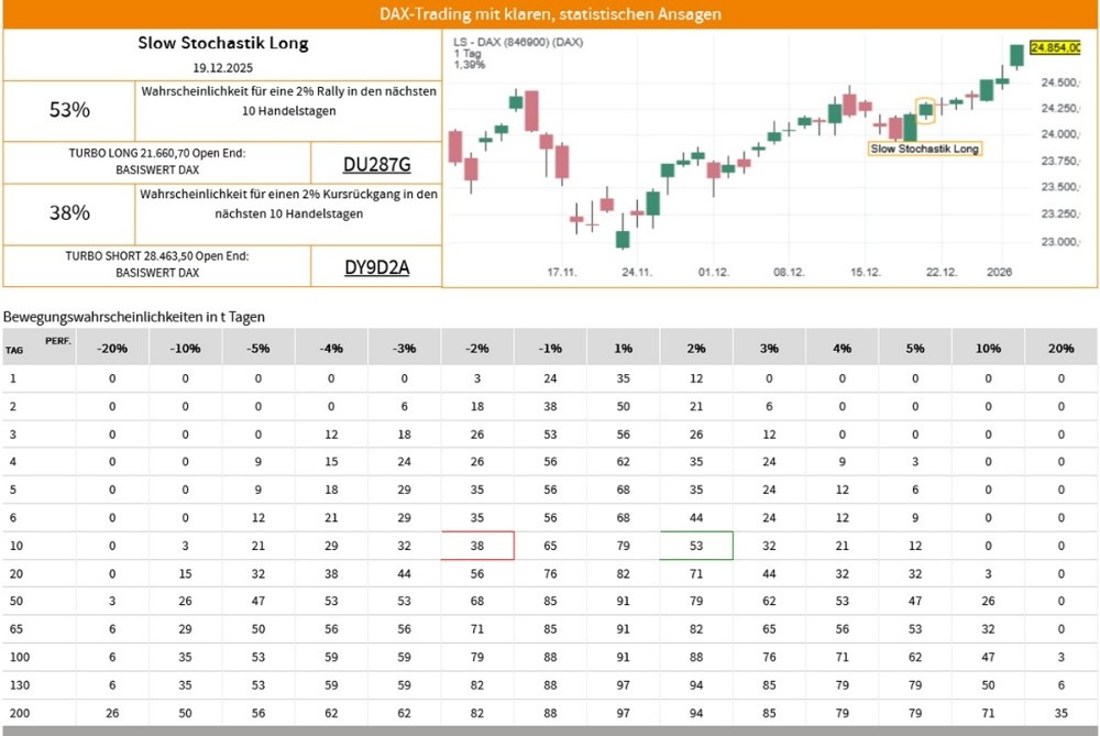Die Erfolgswahrscheinlichkeiten für das Signal "Slow Stochastik Long" beruhen auf einer historischen Auswertung des Signals auf den LS-DAX im Zeitraum vom 02.01.2000 bis zum 05.01.2026. Dabei wurden die folgenden Voreinstellungen und Filter vorgenommen: