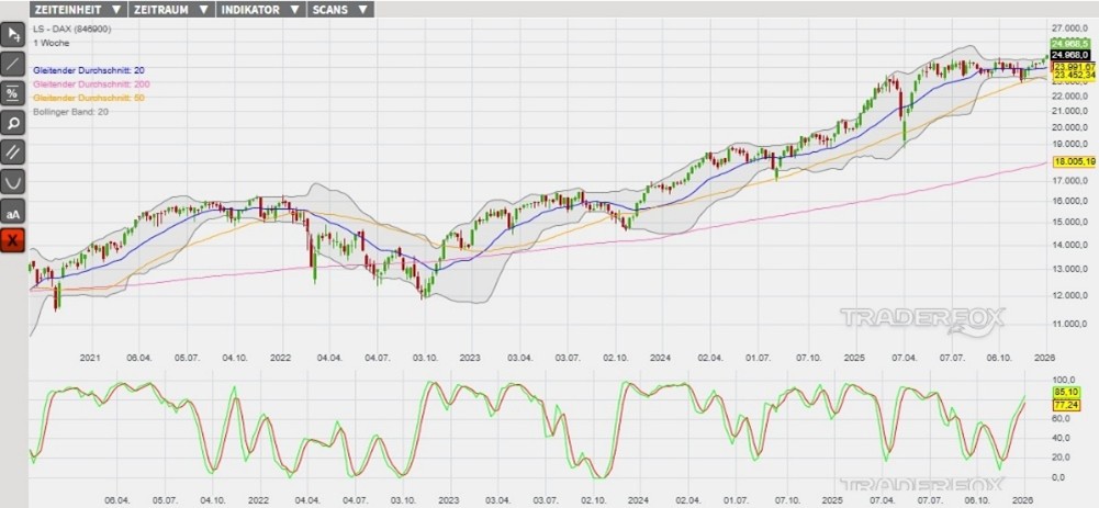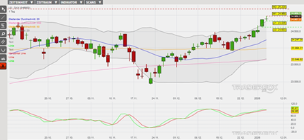 Der DAX befindet sich in einem übergeordneten Aufwärtstrend. Dabei wurde am 21. November 2025 ein markantes Verlaufstief im überverkauften Bereich unterhalb des Bollinger-Bandes markiert. Ausgehend von diesem lokalen Minimum setzte ein Trendschub ein, welcher den Index bis zum 12. Dezember 2025 temporär in den überkauften Bereich über das obere Bollinger-Band geführt hat. Eine technische Gegenreaktion mündete anschließend am 18. Dezember in einem höheren Verlaufstief und der erfolgreichen Verteidigung des gleitenden Durchschnitts der letzten 50 Börsentage (= GD 50). Seither hat der Index bereits an acht aufeinander folgenden Handelstagen steigende Hochs und Tiefs ausgebildet. Verstärkt wird die Aufwärtsdynamik neben den sich nach oben ausweitenden Bollinger-Bändern auch dadurch, dass der Index am 06. Januar auf ein Allzeithoch ausgebrochen ist. Weitere charttechnische Bestätigungen für die Trendfortsetzung werden derzeit durch die Kaufsignale des GD 20, GD 50, GD 200 und eines in der Slow Stochastik erzeugt. Allerdings notiert der Index über dem oberen Bollinger-Band und auch die Signallinien der Slow Stochastik sind im überkauften Bereich. Eine technische Gegenreaktion könnte somit zeitnah bevorstehen.