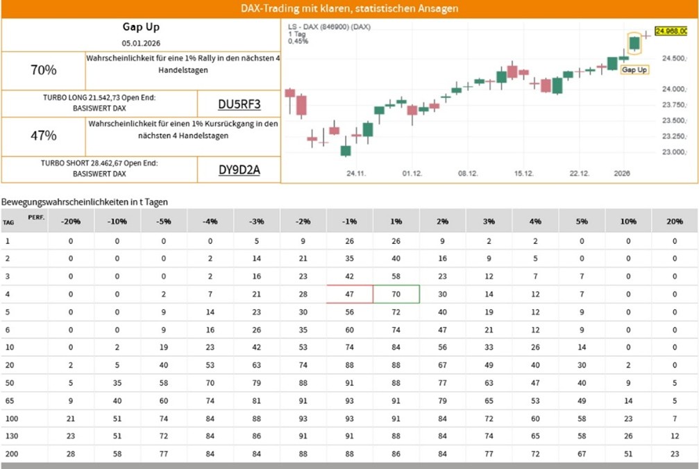 Im Szenario einer Fortsetzung des Aufwärtstrends könnte der DAX heute neue Bestmarken ins Visier nehmen. Hierbei markiert das Allzeithoch vom 06. Januar bei 24.968 Punkten (Widerstand 1) die erste Barriere. Der Kursanstieg über dieses Hindernis würde ein prozyklisches Kaufsignal erzeugen, welches weitere Kursanstiege in Richtung 25.200 Punkten (Widerstand 2) auslösen könnte. Als eine Anlagemöglichkeit in den DAX stehen verschiedene derivative Produkte zur Verfügung. Ein Beispiel ist der ENDLOS TURBO LONG 21.542,73 OPEN END: BASISWERT DAX der DZ BANK (WKN: DU5RF3)* mit einem Basispreis von 21.542,73 Punkten. Der Hebel liegt am 07.01.2026 um 07:00 Uhr bei rund 7,29. Das Long-Szenario ist hinfällig, wenn der DAX nachhaltig unter die Unterstützung bei 24.633 Punkten (Unterstützung 2) fällt. Bitte beachten Sie die Produktrisiken, welche unten im Dokument beschrieben sind.