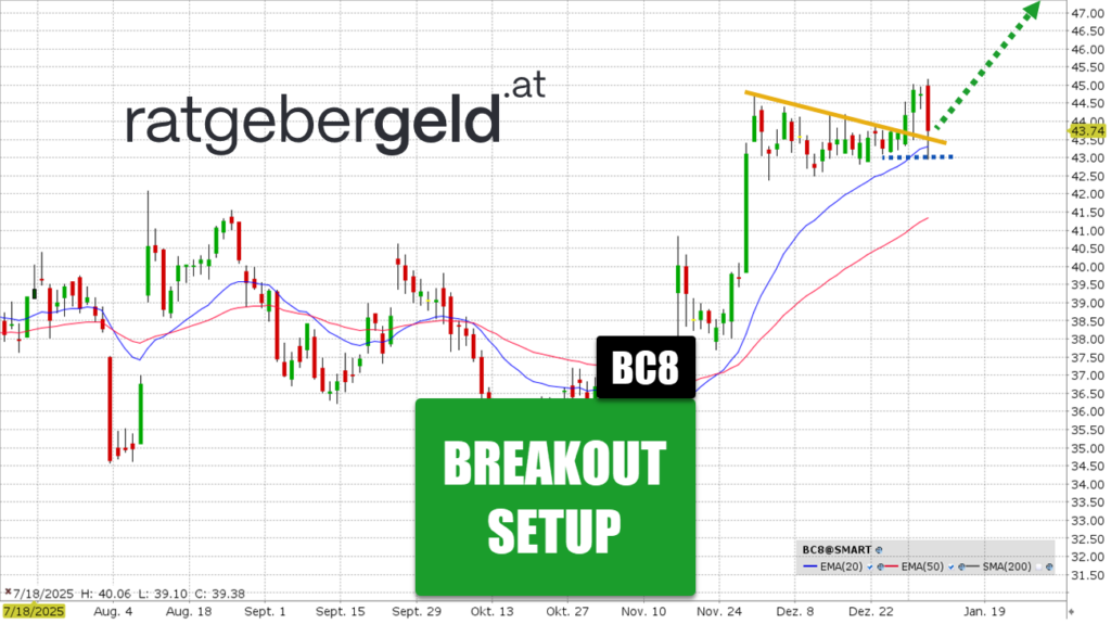 Sollte der Kurs nicht nachhaltig über das 52-Wochenhoch bei rund 45 Euro steigen, könnte Folgendes passieren: Die Aktie fällt unter die Marke von 43 Euro und es rückt schnell der EMA50 bei ca. 41,50 Euro als nächste Ziele in den Fokus der Bären.