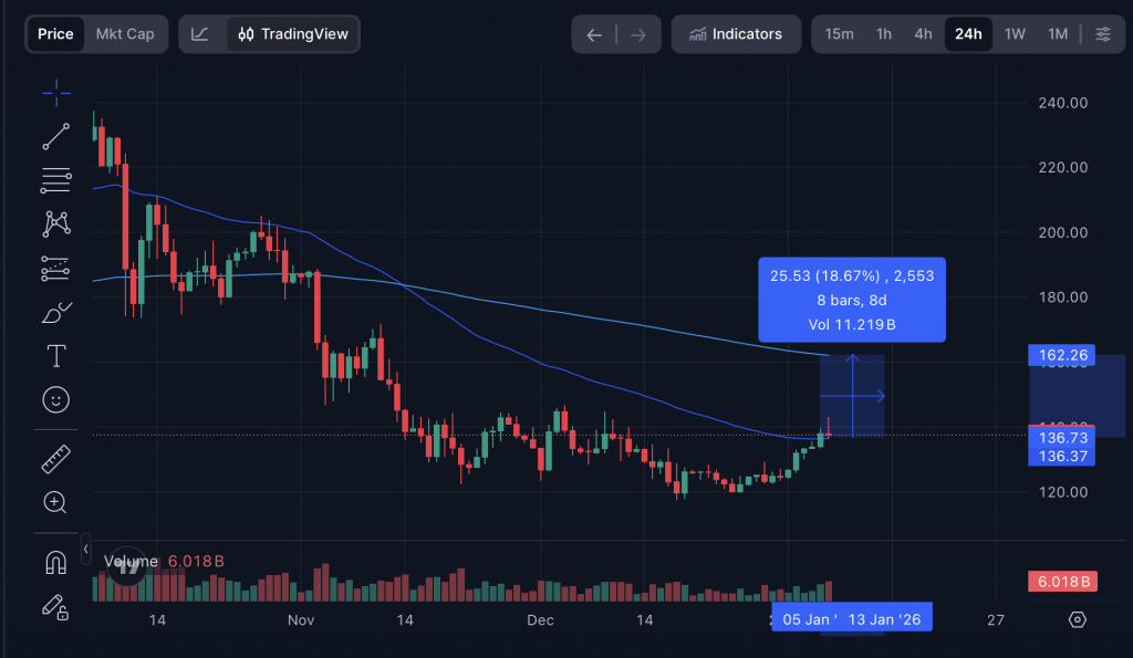 Im Fokus steht nun der Bereich um 145 US-Dollar, der zuletzt als markanter Widerstand fungierte. Gelingt Solana ein nachhaltiger Ausbruch über diese Zone, rückt der EMA200 bei etwa 160 US-Dollar in den Blick. Ein Überwinden dieses Niveaus würde aus technischer Sicht den Weg für eine deutlich stärkere Bewegung öffnen.