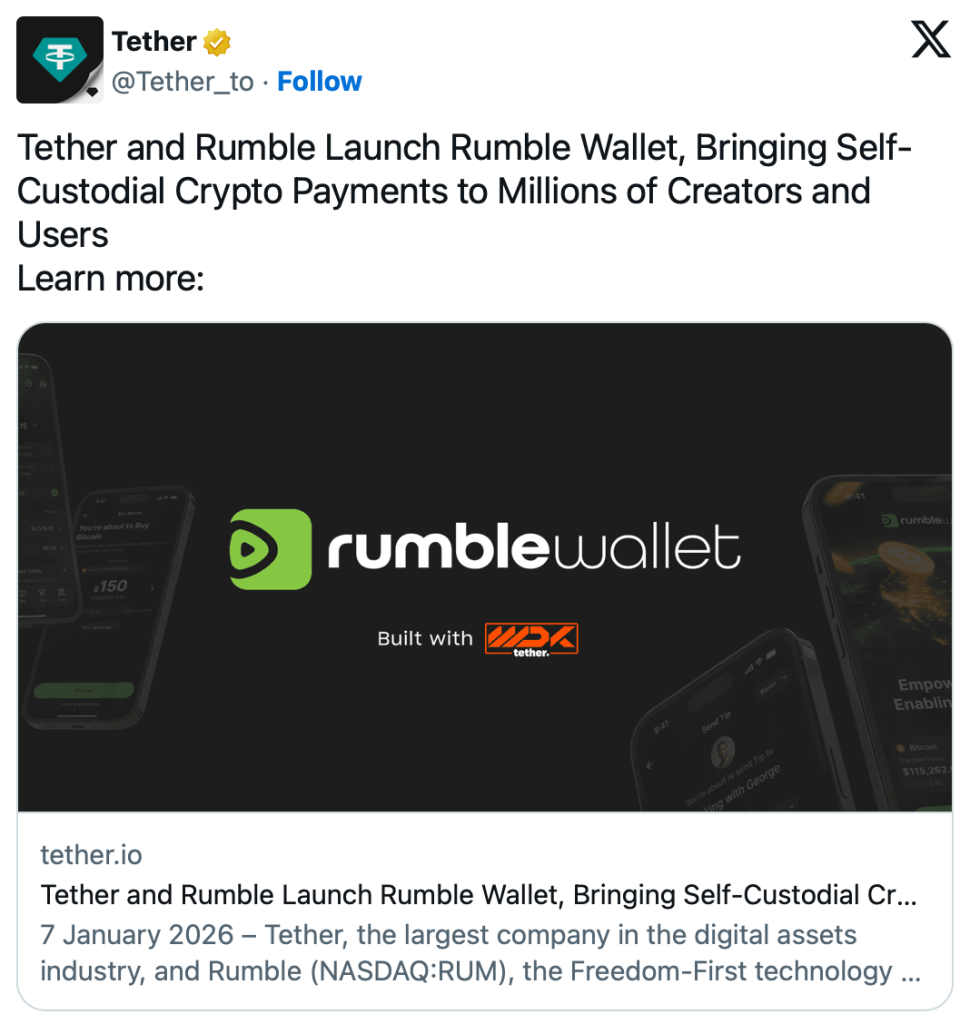 Die YouTube-Alternative Rumble Inc. und der Stablecoin-Gigant Tether haben gemeinsam eine Neuerung im Bereich Social-Media-Monetarisierung vorgestellt: die Rumble Wallet - eine direkt in die Rumble-Plattform integrierte, nicht-verwahrende Krypto-Wallet, womit Creator direkt und ohne Zwischenhändler mit Kryptowährungen unterstützt werden können.