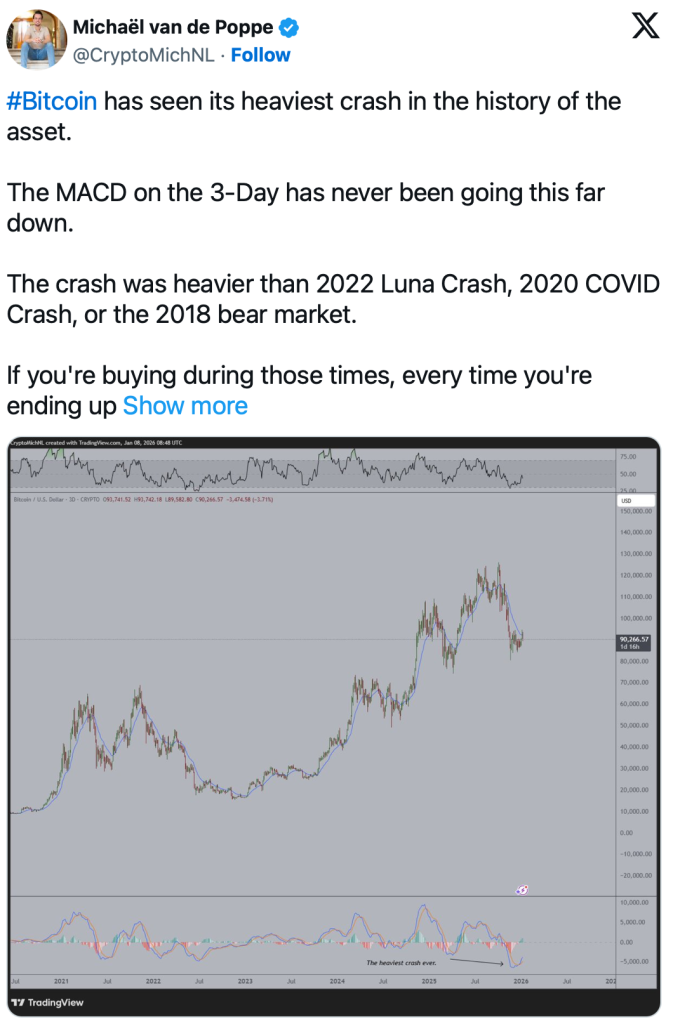 Der Krypto-Analyst Michaël van de Poppe sorgt nun mit einer drastischen Einschätzung für Aufmerksamkeit: Seiner Analyse zufolge erlebt Bitcoin aktuell einen der heftigsten Einbrüche seiner gesamten Geschichte, gemessen nicht nur am Preis, sondern vor allem an der technischen Struktur des Marktes. Entscheidend ist für ihn der MACD-Indikator auf dem 3-Tages-Chart. Dieser misst die Dynamik und Richtung eines Trends und zeigt an, wie stark ein Markt überkauft oder überverkauft ist.