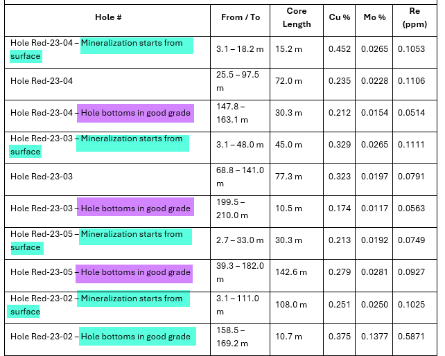 Der Clou an dieser News ist, dass dieses Gebiet zum allerersten Mal in einer Tiefe von über 200 Metern untersucht wird. Über einen halben Kilometer (511 Meter) trieb man das Bohrgerät in den Fels. Der Grund dafür ist, dass die bislang bekannten historischen Bohrungen oft in Mineralisierung endeten (siehe Tabelle) - das heißt, dass diese nie das Ende der Mineralisierung erreicht haben.