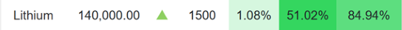 Der Lithiumpreis ist im Vergleich zum Vorjahr um etwa 85% auf 140.000 CNY (20.062 USD) gestiegen