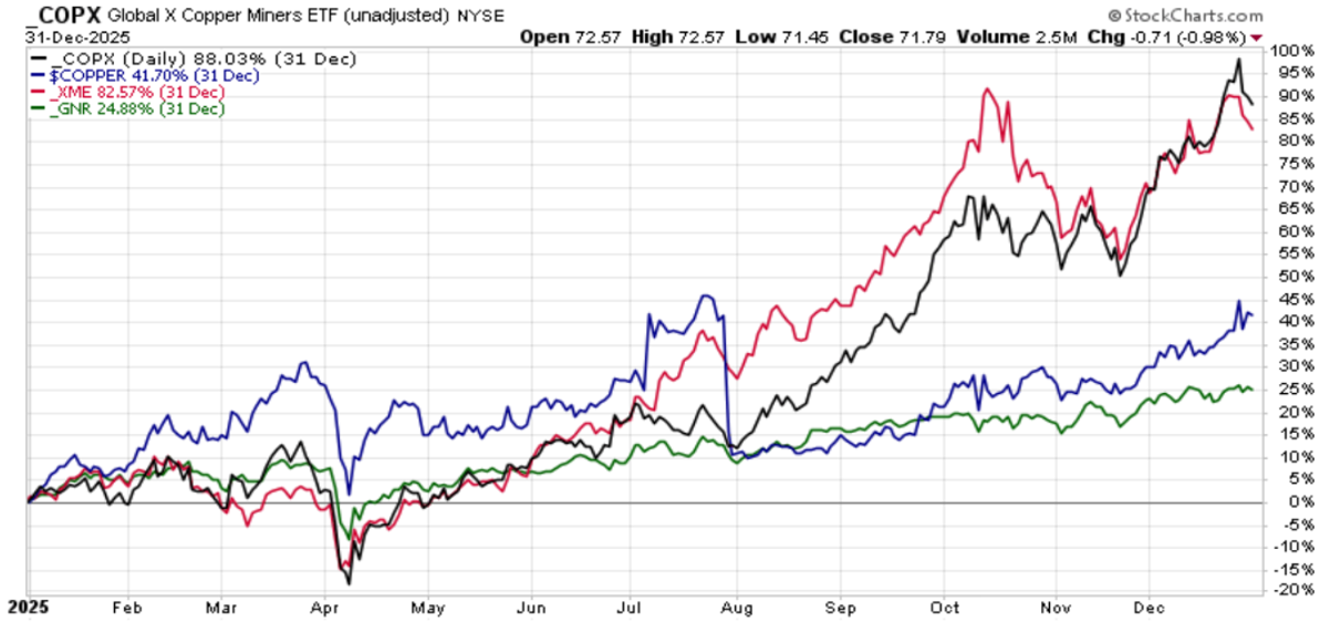 Auch der Basismetall-Sektor kratzte im letzten Jahr an den Superlativen. So legte der Preis des essenziellen Industrie- & Zukunftsmetalls Kupfer um über 40% zu und nahm die Kupferminen (COPX-ETF, +88%) sowie den breit diversifizierten großen Metals-&-Minen-ETF XME (+83%) mit auf seine stellare Reise.