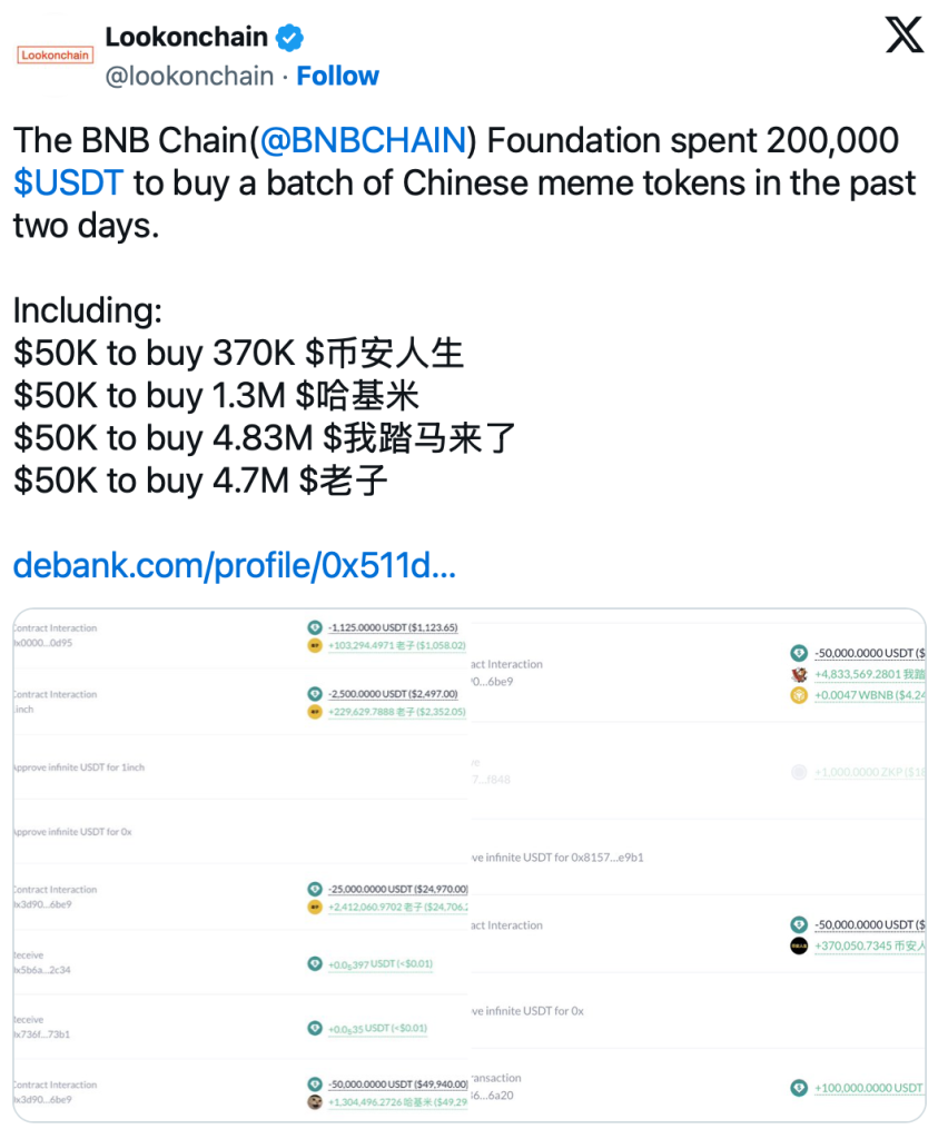 Die BNB Chain Foundation hat in den vergangenen zwei Tagen rund 200.000 USDT aus ihrem Fonds eingesetzt, um gezielt chinesischsprachige Meme-Tokens zu erwerben. Laut On-Chain-Analysen von Lookonchain flossen jeweils 50.000 USDT in die Projekte ????, ???, ????? und ??. Der Schritt sorgt in der Kryptocommunity für Diskussionen, da die Foundation damit ungewöhnlich direkt in hochspekulative Community-Assets eingreift. Er erfolgt vor dem Hintergrund verstärkter Meme-Aktivität auf der BNB Chain und steht im Kontext eines 100-Millionen-Dollar-Incentive-Programms.
