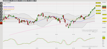 Ausgehend vom Mehrmonatstief am 21. November bei 22.937 Punkten konnte der DAX einen Trendschub vom unteren Bollinger-Band bis zum 12. Dezember bei 24.475 Punkten und damit temporär bis in den überkauften Bereich über das obere Bollinger-Band absolvieren. Die überkaufte Marktlage hatte anschließend eine technische Gegenreaktion ausgelöst, welche am 18. Dezember in einem höheren Verlaufstief bei 23.918 Punkten gemündet ist. Ausgehend von diesem lokalen Minimum wurde ein neuer Trendschub eingeleitet, welcher den Index bereits seit 12 Handelstagen in Folge mit täglich steigenden Hoch- und Tiefpunkten steigen lässt. Außerdem wurde an den letzten sechs Handelstagen jeweils ein neues Allzeithoch markiert. Die sich ausweitenden Bollinger-Bänder und die Kaufsignale der gleitenden Durchschnitte der letzten 20, 50 und 200 Handelstage (= GD 20, GD 50 und GD 200) könnten wiederum dazu beitragen, dass sich der Aufwärtstrend ausweitet. Die überkaufte Slow Stochastik weist ebenfalls ein Kaufsignal aus, sofern die grüne Signallinie des Oszillators über der roten Signallinie notiert. Im Szenario einer Trendfortsetzung markiert das Allzeithoch vom 12. Januar bei 25.428 Punkten (Widerstand 1) die erste Barriere. Der Kursanstieg auf neue Höchststände würde ein prozyklisches Kaufsignal erzeugen. Hierdurch könnten wiederum weitere Kursanstiege bis zur psychologischen Hürde bei 25.800 Punkten (Widerstand 2) begünstigt werden. Impulse erwarten die Anleger heute insbesondere aus den USA, wo die wöchentliche ADP-Beschäftigungsveränderung sowie der Verbraucherpreisindex für Dezember veröffentlicht werden. Vorbörslich wird der DAX mit einem Kursanstieg von +0,2 % getaxt. Das Long-Szenario ist hinfällig, wenn der DAX unter die Marke von 24.835 Punkten (Unterstützung 2) fällt.