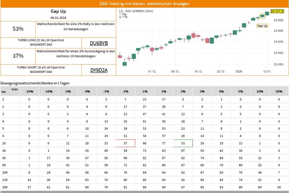Die Erfolgswahrscheinlichkeiten für das Signal "Gap Up" beruhen auf einer historischen Auswertung des Signals auf den LS-DAX im Zeitraum vom 02.01.2000 bis zum 12.01.2026. Dabei wurden die folgenden Voreinstellungen und Filter vorgenommen: