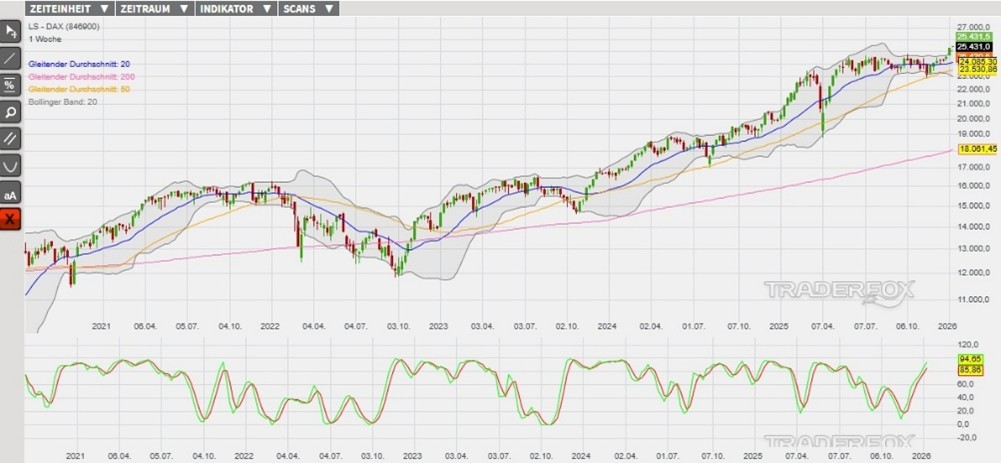 Der DAX befindet sich in einem langfristigen Aufwärtstrend, welcher ausgehend vom lokalen Minimum am 18. Dezember im Bereich des gleitenden Durchschnitts der letzten 50 Börsentage (= GD 50) durch eine Trendbeschleunigung geprägt ist. Seither konnte der DAX bereits an 12 Handelstagen in Folge täglich steigende Hochs und Tiefs markieren. Die Dynamik hat den Index außerdem an den letzten sechs Handelstagen jeweils auf ein neues Allzeithoch und zugleich in den überkauften Bereich über das obere Bollinger-Band steigen lassen. Verstärkt wird die Dynamik neben den sich ausweitenden Bollinger-Bändern auch durch die Signallinien der Slow Stochastik, welche sich ihren Extremniveaus von 100 Punkten angenähert haben. Die Kaufsignale der gleitenden Durchschnitte der letzten 20, 50 sowie 200 Handelstage (= GD 20, GD 50 sowie GD 200) sind derweil weiterhin intakt. Trotz der überkauften Situation, welche zeitnah eine technische Gegenreaktion erforderlich machen wird, könnte sich der übergeordnete Aufwärtstrend demnach ausweiten.