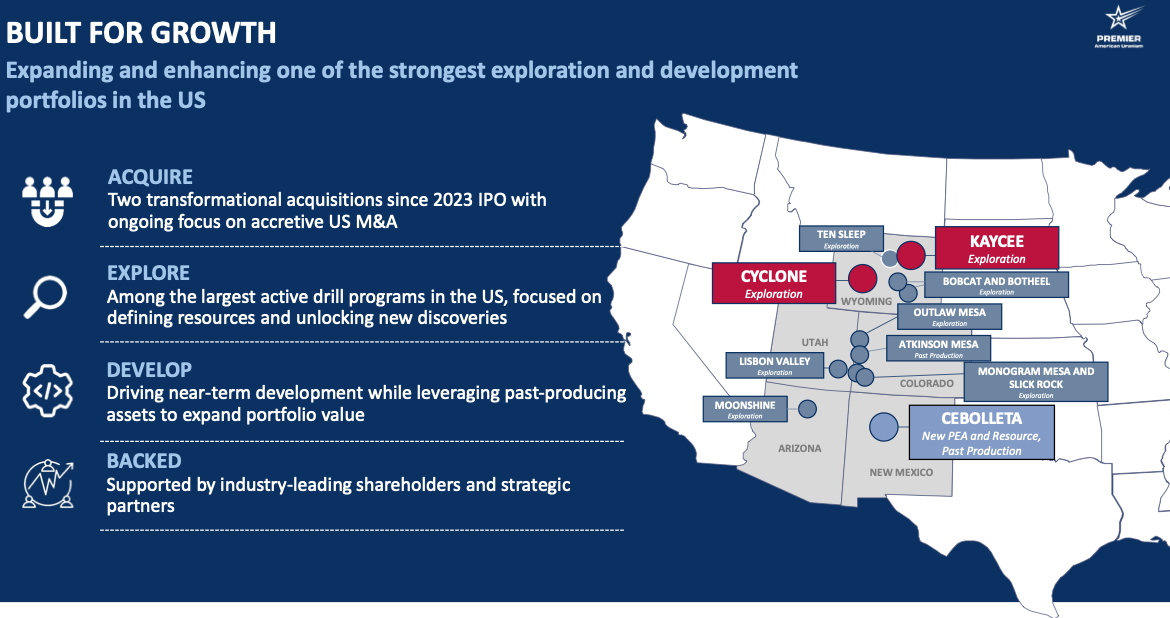 Premier American Uranium Inc. (WKN: A3ET9P) bündelt Projekte in fünf führenden US-Uran-Distrikten der bedeutendsten uranhaltigen Regionen des Landes - von New Mexicos historisch reichen Grants Mineral Belt bis in die weiten Becken von Wyoming und Colorado.