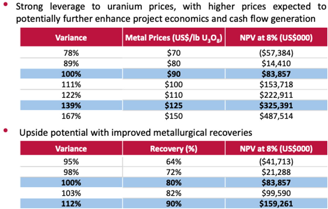 Besonders spannend ist die Hebelwirkung auf den Uranpreis: Bei 100 US-Dollar pro Pfund steigt der NPV schon auf fast 154 Mio. US-Dollar, bei 125 US-Dollar pro Pfund Uran sogar auf 325 Mio. US-Dollar sowie bei 150 US-Dollar pro Pfund auf unglaubliche 488 Mio. US-Dollar.