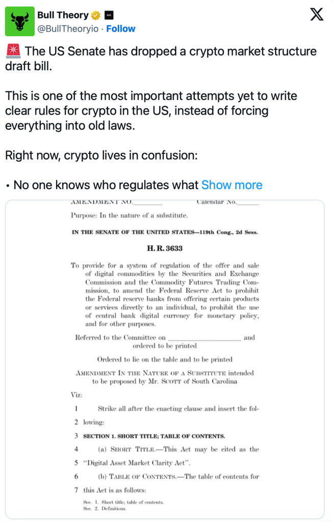 Der US-Senat hat einen umfassenden Entwurf für ein neues Marktstrukturgesetz im Kryptobereich veröffentlicht, das digitale Vermögenswerte erstmals auf eine eigenständige rechtliche Basis stellen soll. Bisherige Unsicherheiten durch veraltete Finanzgesetze und anhaltende Konflikte zwischen SEC und CFTC sollen damit ein Ende finden. Der Entwurf verspricht klare Kategorisierungen, definierte Zuständigkeiten und mehr Transparenz, was als potenziell historischer Schritt für den gesamten Kryptomarkt gilt. Für Investoren, Projekte und institutionelle Akteure könnte dies den Weg zu größerer Stabilität und Kapitalzuflüssen ebnen.
