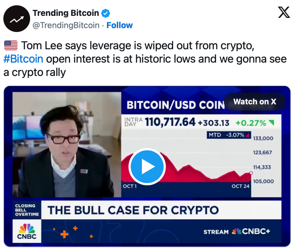 Der bekannte Analyst Tom Lee hat sich in einem CNBC-Interview erneut optimistisch gezeigt und eine deutliche Rallye bei Bitcoin in Aussicht gestellt. Er verweist darauf, dass die aktuell niedrigen Leverage-Quoten im Markt eine schnelle Kursreaktion auf neue Käufe wahrscheinlich machen. Lee geht davon aus, dass die Euphorie nach den massiven Liquidationen im Oktober zurückkehrt und Bitcoin bis Ende Januar 2026 ein neues Allzeithoch erreichen könnte.
