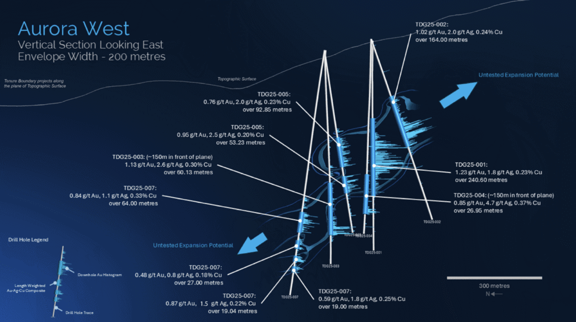 "Aurora West' / "Greater Shasta-Newberry' vom Betreiber TDG Gold Corp. in British Columbia hält OR Royalties eine 1,0% "NSR'. Top Bohrergebnisse wie in Bohrloch DG25-002 lieferten beispielsweise 11,02 g/t Au, 2,0 g/t Ag und 0,24% Cu über 164,0 m, inklusive eines höhergradigen Abschnitts von 1,73 g/t Au, 2,6 g/t Ag, 0,32% Cu über 67,0 m. Gemeldet wurde zudem eine neue Erweiterung, beginnend in 175 m vertikaler Tiefe, die offen ist für weitere Expansion.
