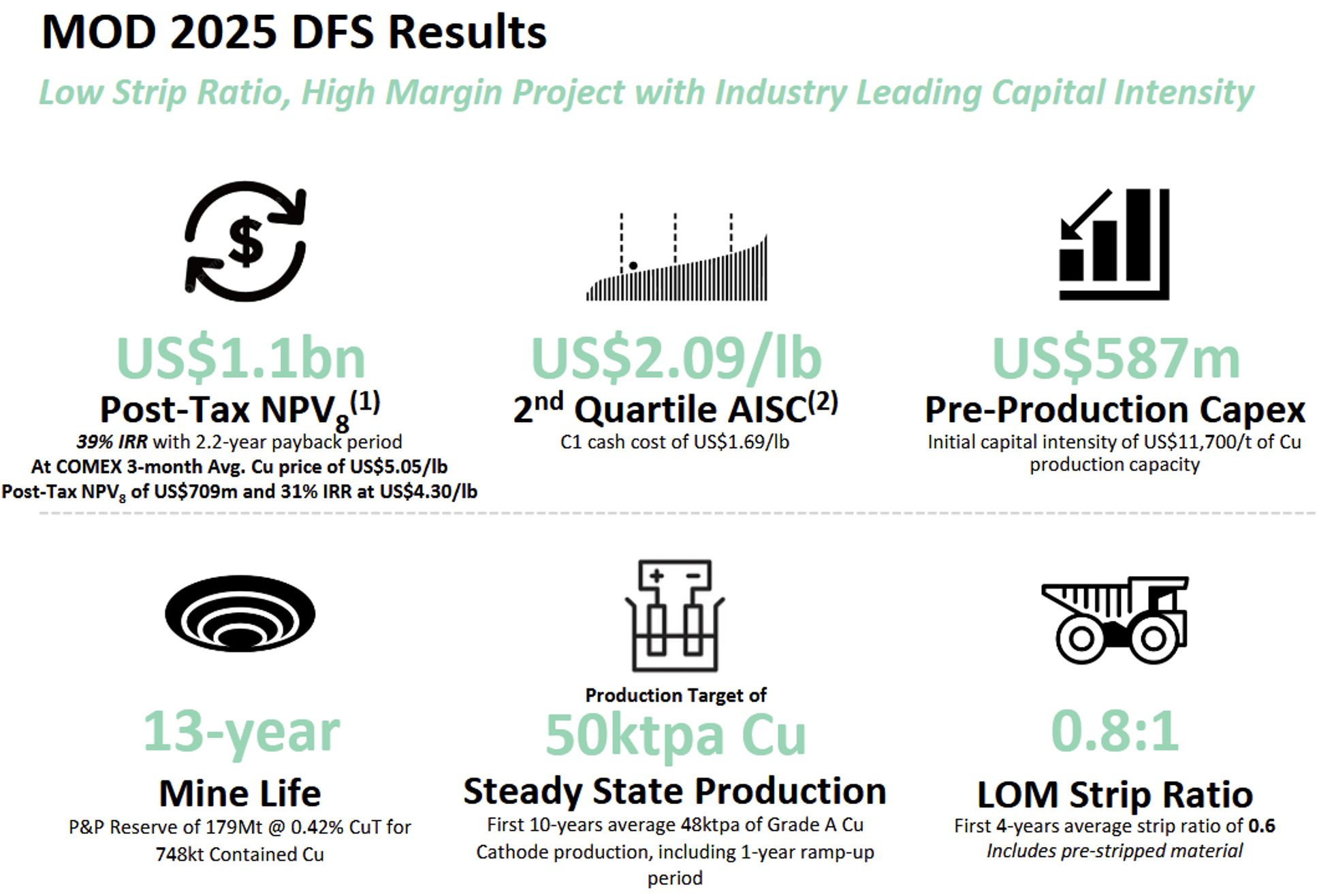 "Marimaca' (Chile, Betreiber: Marimaca Copper Corp.) - eine der wenigen großen Kupferentdeckungen der letzten Dekade. OR Royalties (WKN: A417BX) ist mit 1% "NSR' beteiligt. Ein zentraler Meilenstein wurde erreicht, nämlich die Resolución de Calificación Ambiental als formelle Genehmigung zur im Dezember 2024 eingereichten Umweltverträglichkeitserklärung. Damit kann die nächste Genehmigungsphase beschleunigt werden. Das Ziel: bis Mitte des laufenden Jahres baureif zu sein. Der verbleibende kritische Punkt ist die finale Projektfinanzierung. Die endgültige Machbarkeitsstudie unterstreicht jedoch die wirtschaftliche Attraktivität.