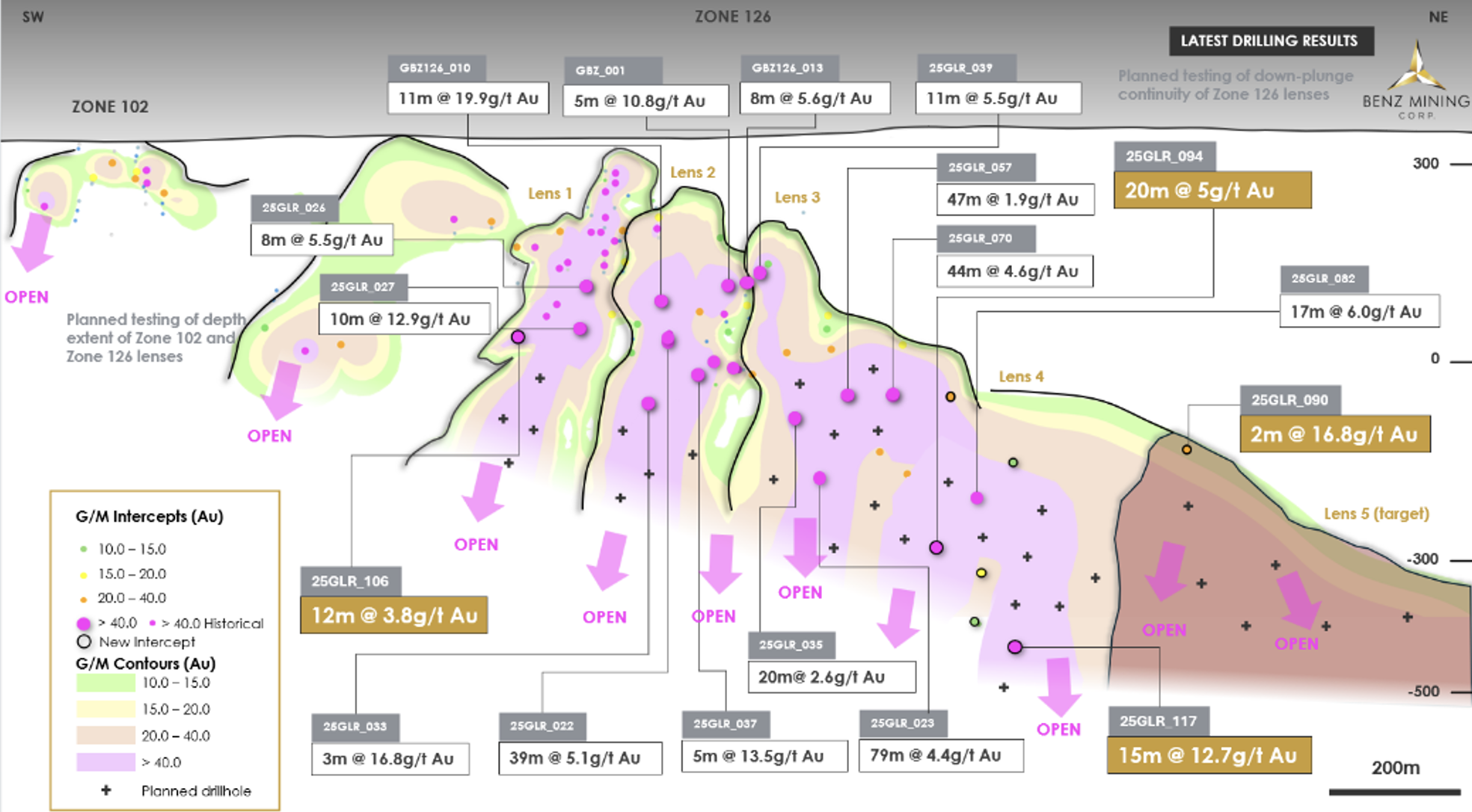 Linse 5 brachte eine neue Entdeckung mit 16,8 g/t Au über 2,0 m ab 528 m, die Interpretation deutet auf Potenzial für dickere und höhergradige Mineralisierung in Fallrichtung hin.