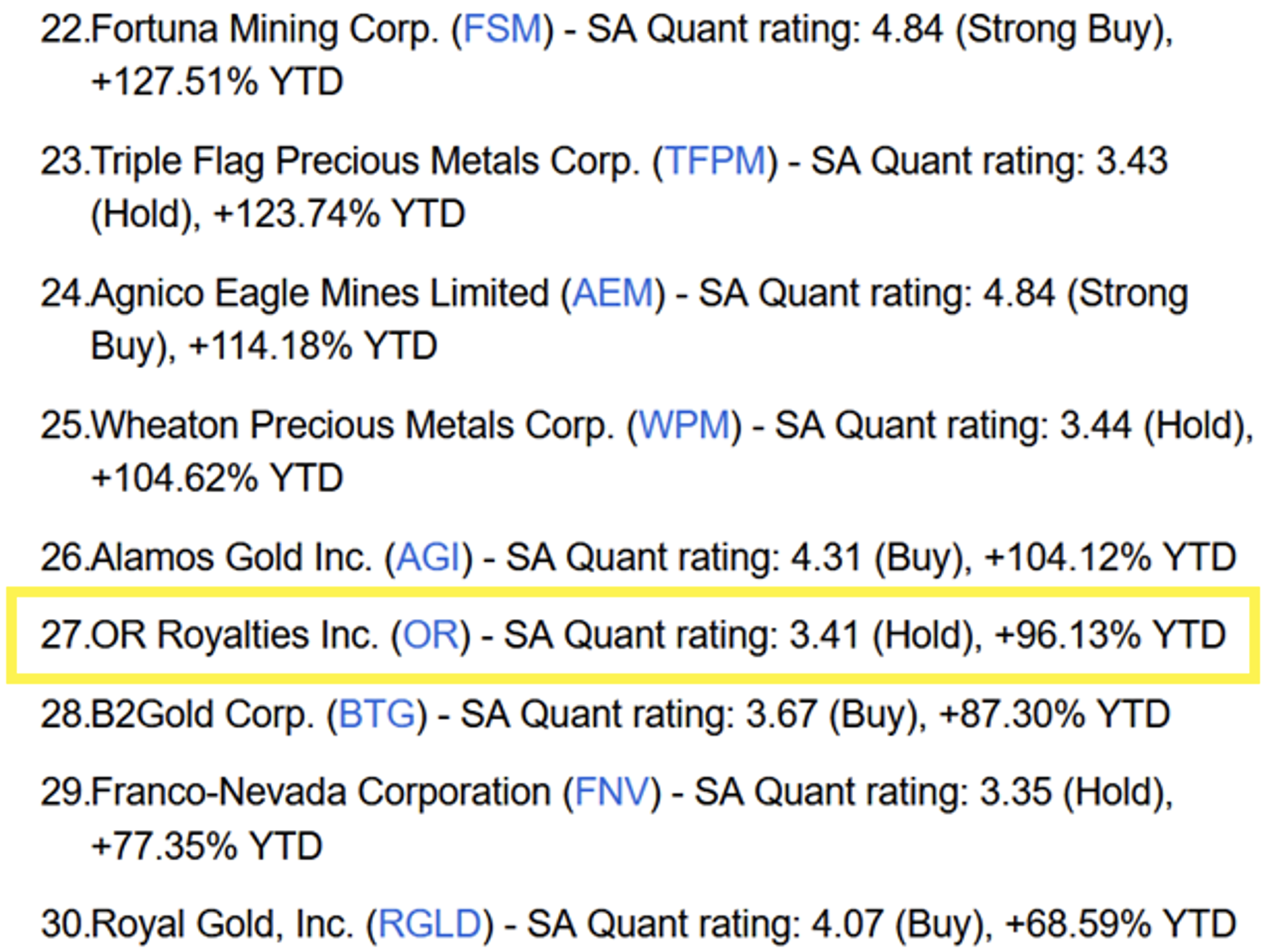 Als zusätzliche Stimmungs-Messung führen Analysten von Seeking Alpha OR Royalties (WKN: A417BX) (Stand 22.12.2025) mit einer Year-to-Date-Performance von +96,13% als "Strong Buy" unter den TOP-30-Goldaktien.
