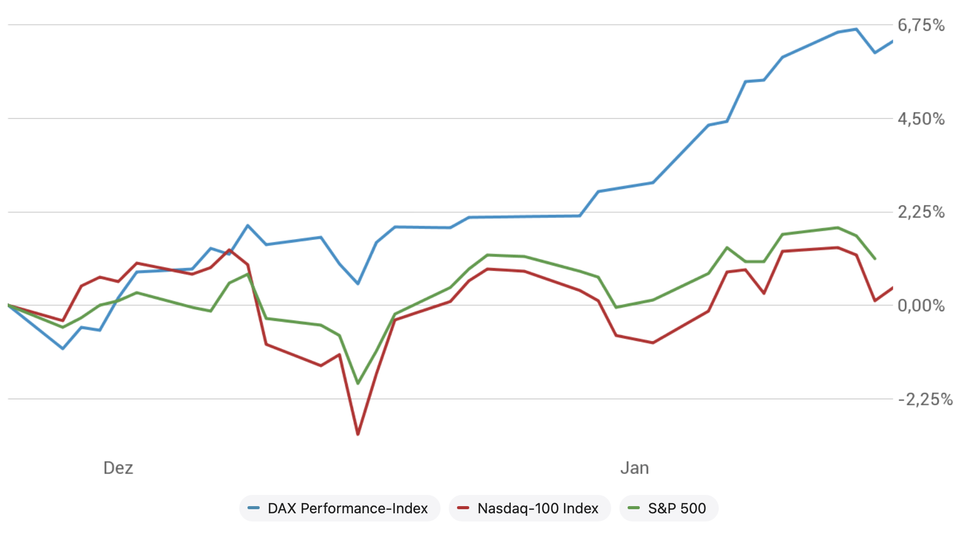 Das hatten wir in der ersten Jahreshälfte letzten Jahres schon und es war die Grundlage dafür, dass der DAX in 2025 mit +22%, den S&P500 mit +4% und den NASDAQ100 mit +8% in Euro so deutlich schlagen konnte. Trotzdem gibt es einen wichtigen Unterschied: Die DAX Outperformance der letzten Wochen ist nicht auf den schwachen US-Dollar zurückzuführen, denn der ist in der Zeit stabil geblieben. Der DAX hat eine eigene, innere Stärke gegenüber der Wall Street. Weiterlesen...