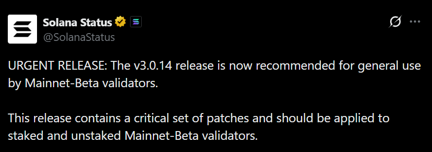 Solana hat die Version v3.0.14 freigegeben und alle Mainnet-Beta-Validatoren zur zeitnahen Installation aufgefordert. Das Update enthält mehrere Patches, die laut Projektteam gezielt auf eine verbesserte Netzwerkstabilität abzielen. Die Empfehlung zur Aktualisierung verbreitete sich schnell im Validator-Netzwerk.