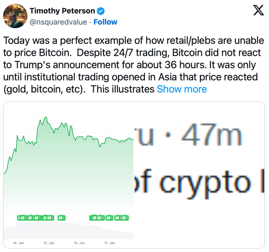 Der jüngste Rücksetzer bei Bitcoin wird vom Analysten Timothy Peterson als Paradebeispiel für typische Fehleinschätzungen privater Investoren bewertet. Bitcoin zeigte zunächst keine unmittelbare Reaktion auf Trumps Ankündigungen, sondern bewegte sich erst rund 36 Stunden später, als die institutionellen Märkte in Asien öffneten - ein Verhalten, das auch bei Gold zu beobachten war. Kurzfristige News werden daher oft nachträglich als Erklärung herangezogen, obwohl die tatsächlichen Impulse von großen, professionellen Akteuren ausgehen.