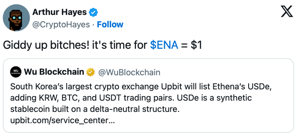 Hayes begründet seine bullische Haltung gegenüber Ethena mit der Listung des Stablecoins USDe auf Upbit, der größten Kryptobörse Südkoreas. Er erwartet, dass diese Entwicklung den Kurs von USDe auf 1,00 US-Dollar katapultieren könnte. Im Gegensatz zu klassischen Stablecoins basiert USDe auf einem Krypto-Portfolio kombiniert mit Shorts in Perpetual-Futures, um die Bindung an den US-Dollar herzustellen.