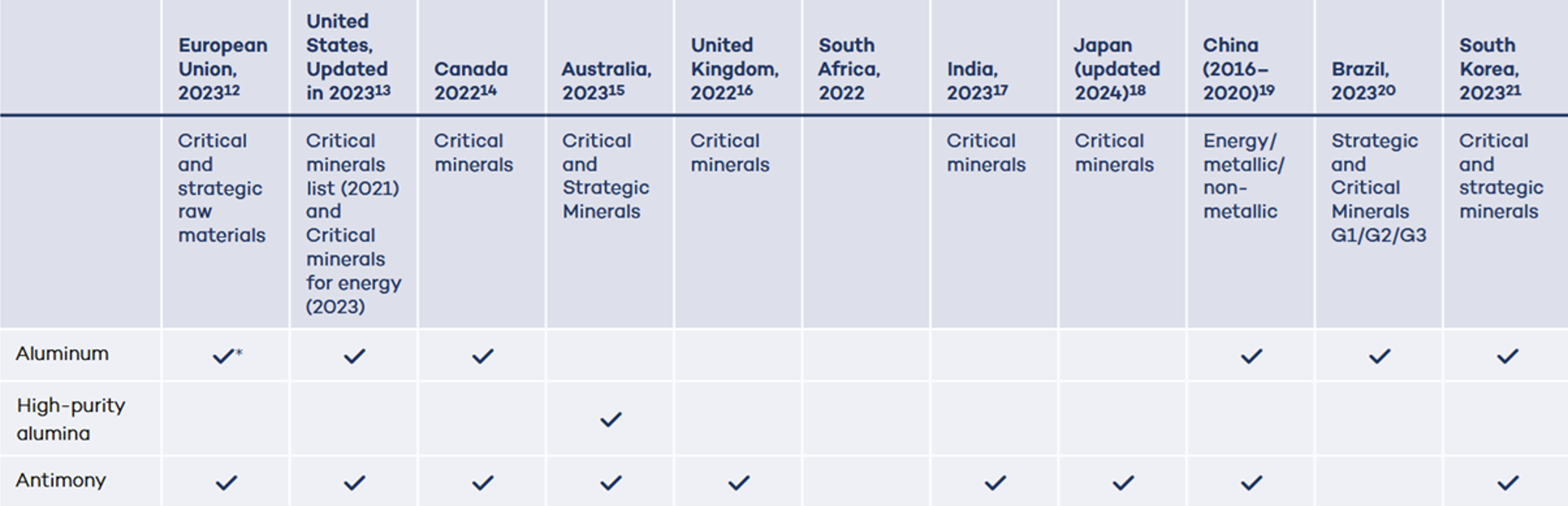 Auszug der Liste kritischer Mineralien in ausgewählten Ländern: