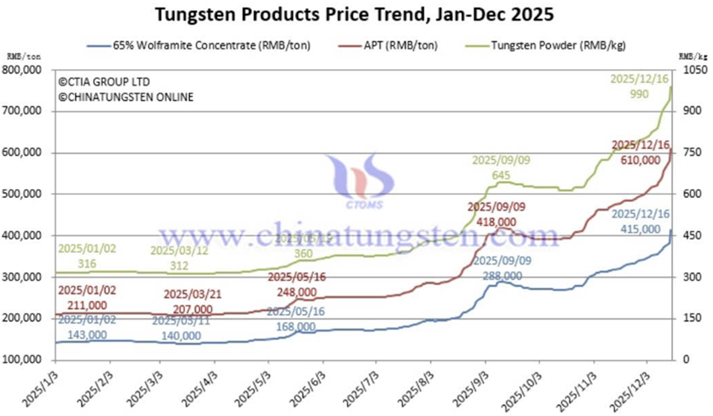 Mit zwischen 70 bis 80% kontrolliert China auch hier einen Großteil der weltweiten Produktion. Infolge der im Laufe des letzten Jahres eingeführten Exportbeschränkungen für strategische Mineralien und damit auch für Wolfram, schoss der Preis pro Pfund für alle wichtigen Wolfram-Erzeugnisse steil nach oben.
