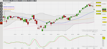 Der DAX konnte am 13. Januar ein Allzeithoch im überkauften Bereich über dem oberen Bollinger-Band markieren. Anschließend wurde eine technische Gegenreaktion zum Abbau der überkauften Marktlage eingeleitet, welche bisher an den letzten vier Handelstagen in Folge jeweils sinkende Hoch- und Tiefpunkte ausgelöst hat. Belastend kommt derzeit ein Verkaufssignal in der Slow Stochastik hinzu, welches ausgelöst wurde, als die grüne Signallinie des Oszillators unter die rote Signallinie gesunken ist. Sollte sich die Abwärtsbewegung in den kommenden Tagen ausweiten, dann könnte der nachhaltige Kursrückgang unter den gleitenden Durchschnitt der letzten 20 Börsentage (= GD 20) ein weiteres Verkaufssignal erzeugen.