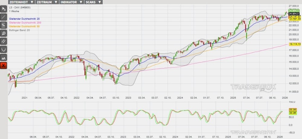 Sofern der DAX die Kursschwäche der letzten vier Handelstage ausweiten sollte, könnte heute das Unterschreiten des Tagestiefs vom 19. Januar bei 24.906 Punkten (Unterstützung 1) im Fokus stehen. Dieser Etappenschritt könnte die Kursentwicklung zum GD 20 führen. Sollte der gleitende Durchschnitt ebenfalls unterboten werden, dann könnte das entstehende Verkaufssignal Folgeverluste bis zum Tagestief vom 05. Januar bei 24.633 Punkten (Unterstützung 2) auslösen. Als eine Anlagemöglichkeit in den DAX stehen verschiedene derivative Produkte zur Verfügung. Ein Beispiel ist der ENDLOS TURBO SHORT 28.451,88 OPEN END: BASISWERT DAX der DZ BANK (WKN: DY9D2A)* mit einem Basispreis von 28.451,88 Punkten. Der Hebel liegt am 20.01.2026 um 07:00 Uhr bei 7,12. Das Short-Szenario ist hinfällig, wenn der DAX über die Marke von 25.510 Punkten (Widerstand 2) steigt. Bitte beachten Sie die Produktrisiken, welche unten im Dokument beschrieben sind.