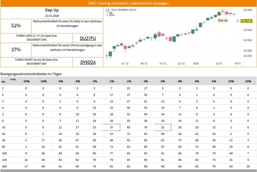 Die Erfolgswahrscheinlichkeiten für das Signal "Gap Up" beruhen auf einer historischen Auswertung des Signals auf den LS-DAX im Zeitraum vom 02.01.2000 bis zum 19.01.2026. Dabei wurden die folgenden Voreinstellungen und Filter vorgenommen: