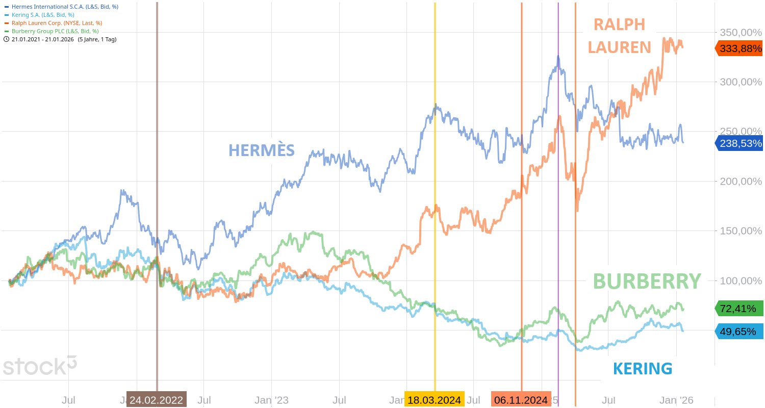 Der Chartvergleich enthält weitere Aktien, die im Ruf von Luxustiteln stehen. Ohne Anspruch auf Vollständigkeit.