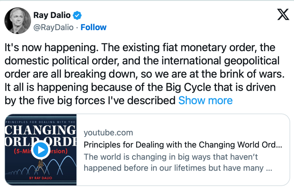 Dalio hatte bereits mehrfach vor einem massiven Vertrauensverlust in den US-Dollar gewarnt. Die aktuelle Währungsentwicklung gibt ihm nach seiner Einschätzung recht, auch wenn ein vollständiger Zusammenbruch noch in weiter Ferne liegt. Dennoch sieht er die Risiken als so gravierend, dass er von einem "Punkt ohne Wiederkehr" spricht.