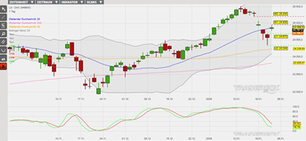 Ausgehend vom Verlaufshoch am 13. Januar bei 25.510 Punkten ist der DAX bis zum lokalen Minimum am 21. Januar bei 24.344 Punkten innerhalb von sieben Tagen um 1.166 Punkte gefallen. Anschließend setzte eine Zwischenerholung in Richtung des gleitenden Durchschnitts der letzten 20 Börsentage (= GD 20) ein. Sollte nach der Zwischenerholung eine lokale Topbildung die Basis für die nächste Verkaufswelle legen, dann könnte sich eine untergeordnete Abwärtstrendstruktur im Chart etablieren. Derzeit weisen bereits die Slow Stochastik und der GD 20 belastende Verkaufssignale aus.