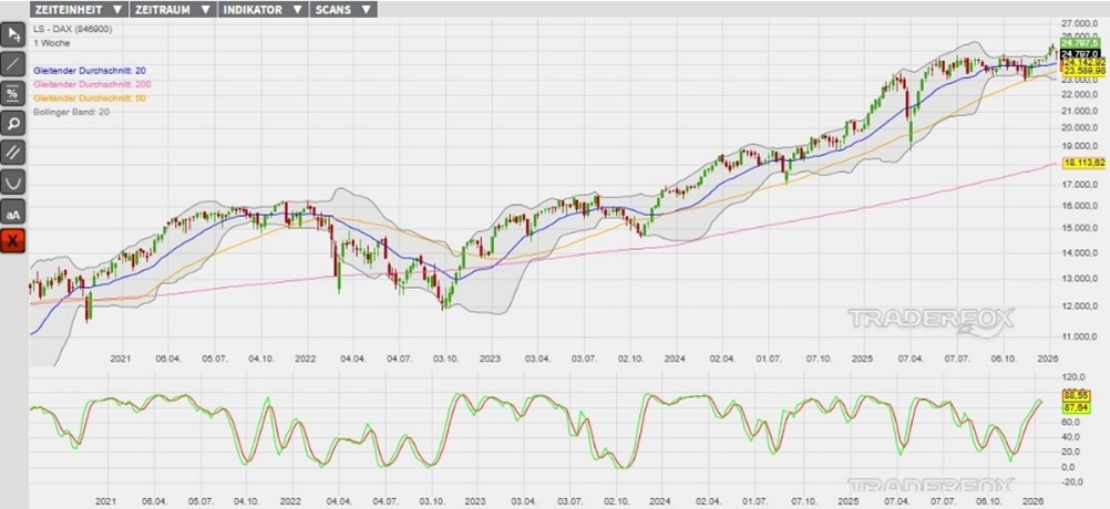 Charttechnisch könnte der DAX eine neue Verkaufswelle einleiten, wenn der nachhaltige Kursanstieg über den GD 20 misslingen sollte. In diesem Szenario markiert das Tageshoch vom 21. Januar bei 24.670 Punkten (Unterstützung 1) den ersten Haltebereich. Durch die Berührung dieser Kursmarke würde wiederum eine noch offene Kurslücke wieder geschlossen werden. Anschließend könnte sich die Abwärtsbewegung in Richtung des Tagestiefs vom 21. Januar bei 24.344 Punkten (Unterstützung 2) ausweiten. Als eine Anlagemöglichkeit in den DAX stehen verschiedene derivative Produkte zur Verfügung. Ein Beispiel ist der ENDLOS TURBO SHORT 27.989,52 OPEN END: BASISWERT DAX der DZ BANK (WKN: DU68X7)* mit einem Basispreis von 27.989,52 Punkten. Der Hebel liegt am 23.01.2026 um 07:00 Uhr bei 7,83. Das Short-Szenario ist hinfällig, wenn der DAX über die Marke von 25.200 Punkten (Widerstand 2) steigt. Bitte beachten Sie die Produktrisiken, welche unten im Dokument beschrieben sind.