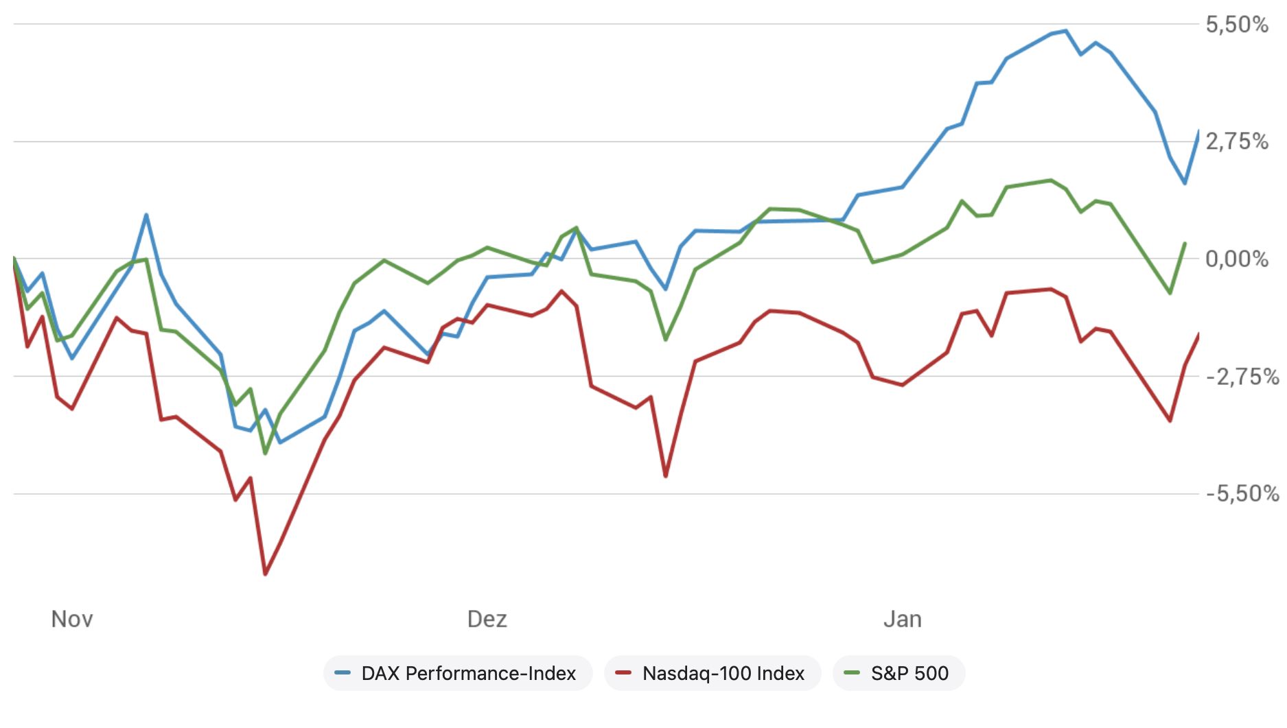 Trump hat die Börsen diese Woche im Atem gehalten: Zoll-Androhungen im Grönland- Konflikt und Säbelrasseln in Davos haben die Märkte belastet. Der DAX hat in der Spitze 1150 Punkte verloren und davon etwa die Hälfte wieder aufgeholt, nachdem Trump bei den Zöllen wieder einen Volte aufs Parkett gelegt hat. Unterm Strich bleibt: Taco*, zerstörtes Vertrauen kommt nicht sofort zurück und die relative Stärke des DAX. Im Chart sieht man das deutlich:
