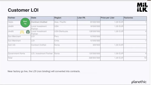 - Bindende Zusagen als Fundament: Über die Vorverträge hinaus wurden bereits verbindliche Verträge über 10+50 Millionen Liter fixiert - ein klarer Beleg für das Vertrauen der Partner in die Lieferfähigkeit und Qualität von Mililk.