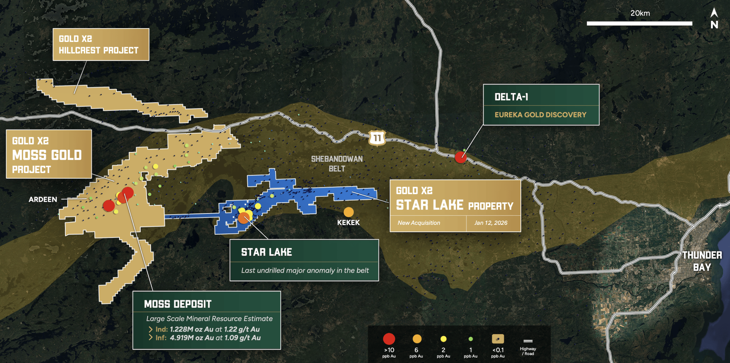 Durch den Erwerb von "Star Lake' könnte Gold X2 die Kontrolle über drei der vier bedeutenden Gold-in-Till-Anomalien gewinnen, die in der regionalen Till-Datenbank des Ontario Geological Survey für den "Shebandowan Greenstone Belt' definiert sind. Das wiederum ist deshalb so spektakulär, weil die Entdeckung von Gold-in-Till-Anomalien ist ein wichtiger Frühindikator für die Identifizierung mineralisierter Zonen unter der Gletscherdecke ist.