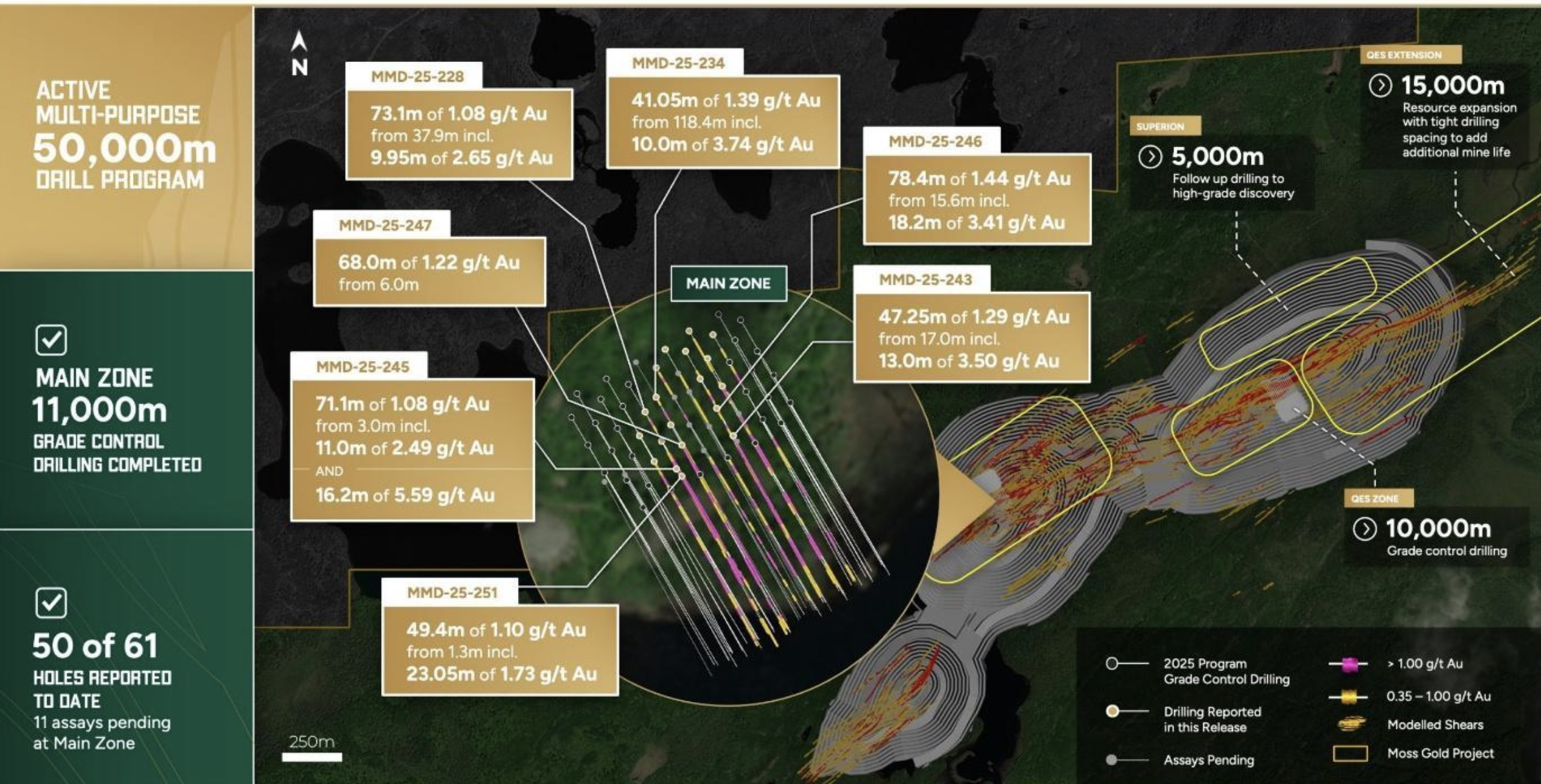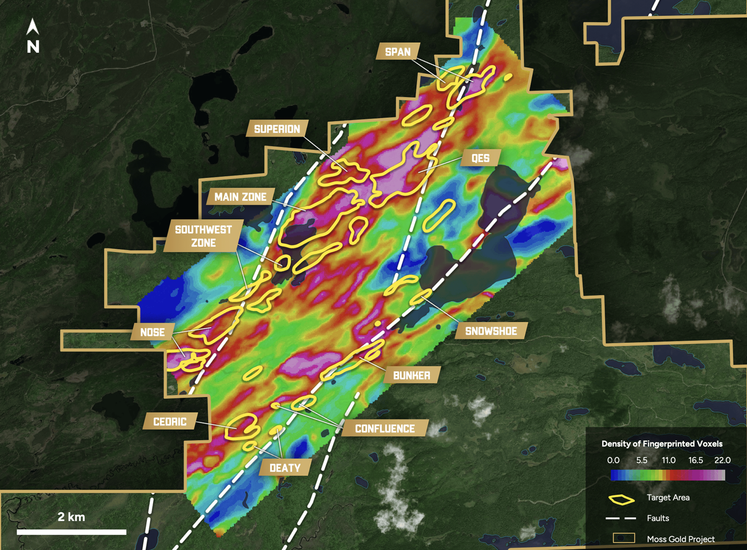 Genauer gesagt, konnte durch die Exploration auch der "Moss'-Trend besser definiert werden, der eine Gesamtlänge von mindestens 8 km umfasst, darunter auch das 1,6 km lange Zielgebiet "Moss Nose', die Erweiterung des nahen "Superion'-Zielgebiets auf eine Länge von 700 m und eine Breite von 500 m und zudem mehrere parallele vielversprechende Ziele mit einer Länge von 600 bis 1.500 m unmittelbar südlich von "Moss' und in einem Trend zwischen "Moss' und "Deaty'.