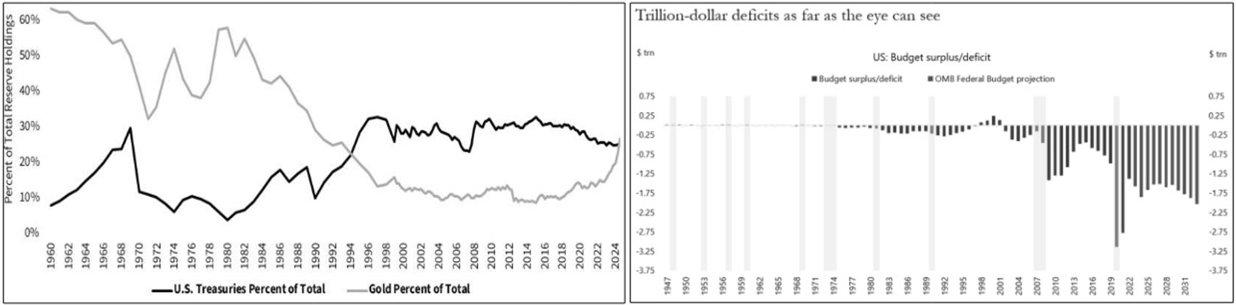 Gold vs. US-Staatsanleihen in den Reserven der globalen Zentralbanken und US-Haushaltsüberschuss/-defizit: