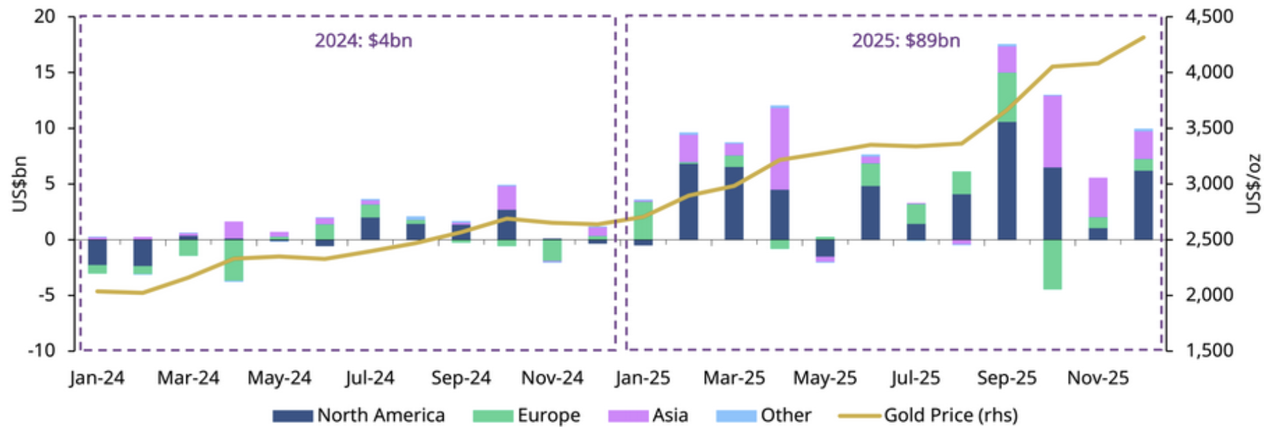 Zuflüsse zu globalen Gold-ETFs im Jahr 2025 in Milliarden USD:
