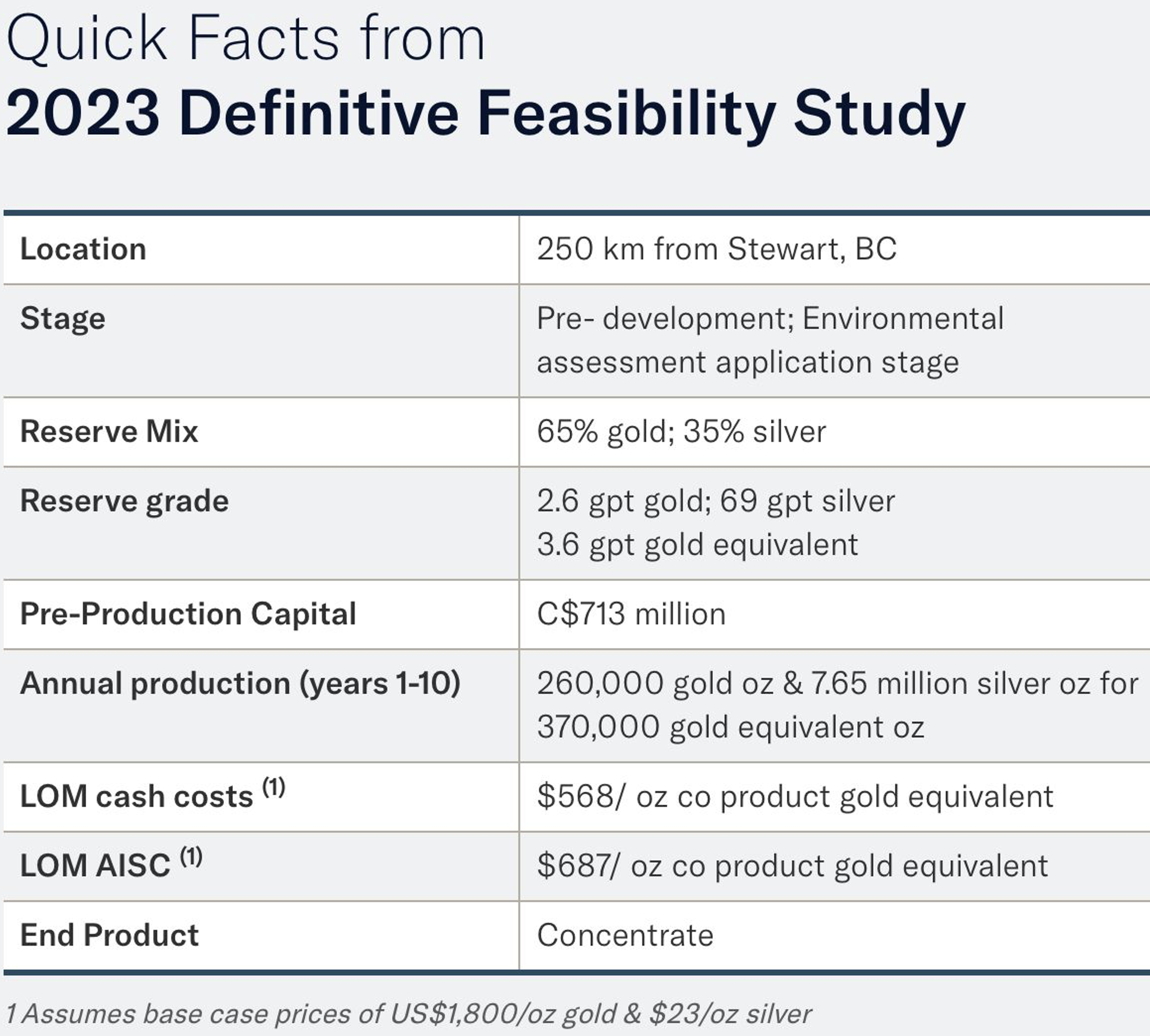 Das Unternehmen legte im November 2023 eine aktualisierte Definitive Feasibility Study (DFS) für Eskay Creek vor. Der Clou, im Base Case wurden da gerade einmal 1.800 USD/Unze Gold und 23 USD/Unze Silber bei einem Diskontsatz 5% angesetzt, und weist schon dabei einen After-Tax NPV(5%) von rund 2,0 Mrd. CAD, eine After-Tax IRR von etwa 43% sowie eine After-Tax Payback-Zeit von rund 1,2 Jahren (auf die Pre-Production CAPEX) aus.