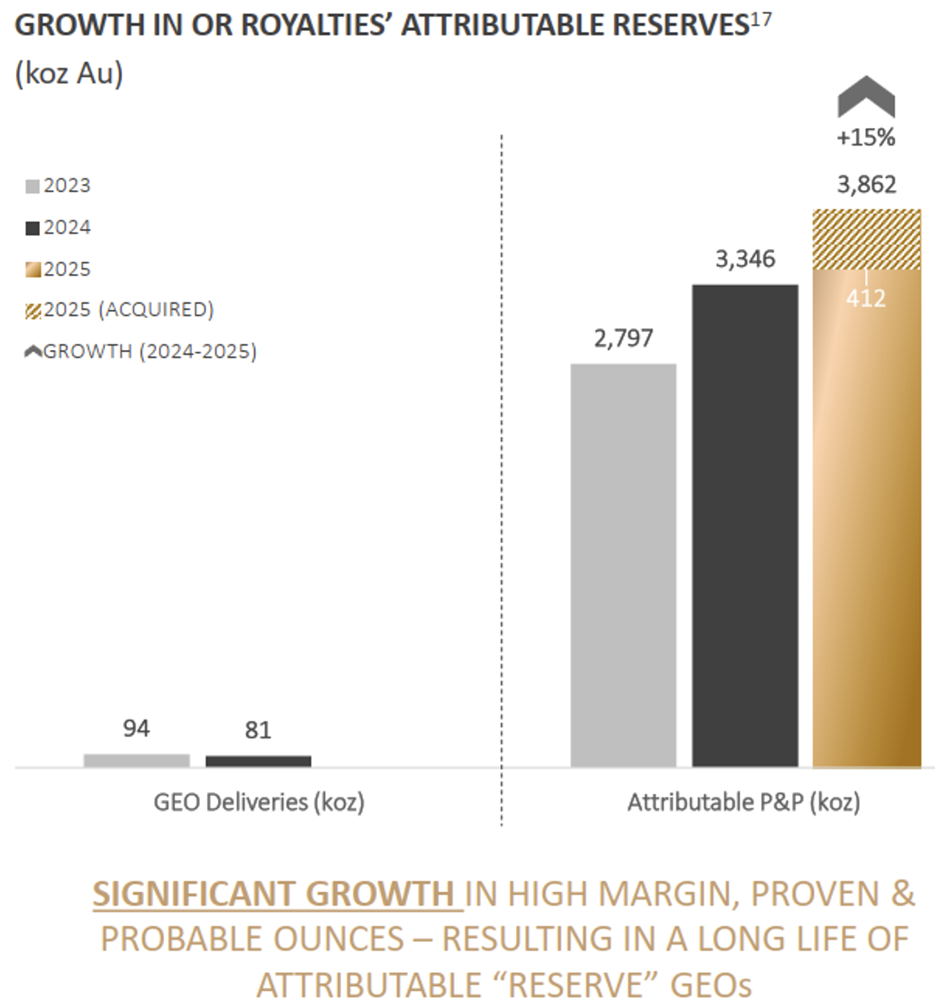 OR Royalties Inc. (WKN: A417BX) liefert jedoch nicht nur kurzfristig, sondern baut seine wirtschaftliche Basis strukturell und kontinuierlich aus. Die zurechenbaren nachgewiesenen und wahrscheinlichen Reserven steigen von 2,797 Millionen Unzen im Jahr 2023 über 3,346 Millionen Unzen 2024 auf 3,862 Mio. Unzen im Jahr 2025. Allein 412.000 Unzen stammen aus Akquisitionen und unterstreichen die aktive Portfolio-Expansion.