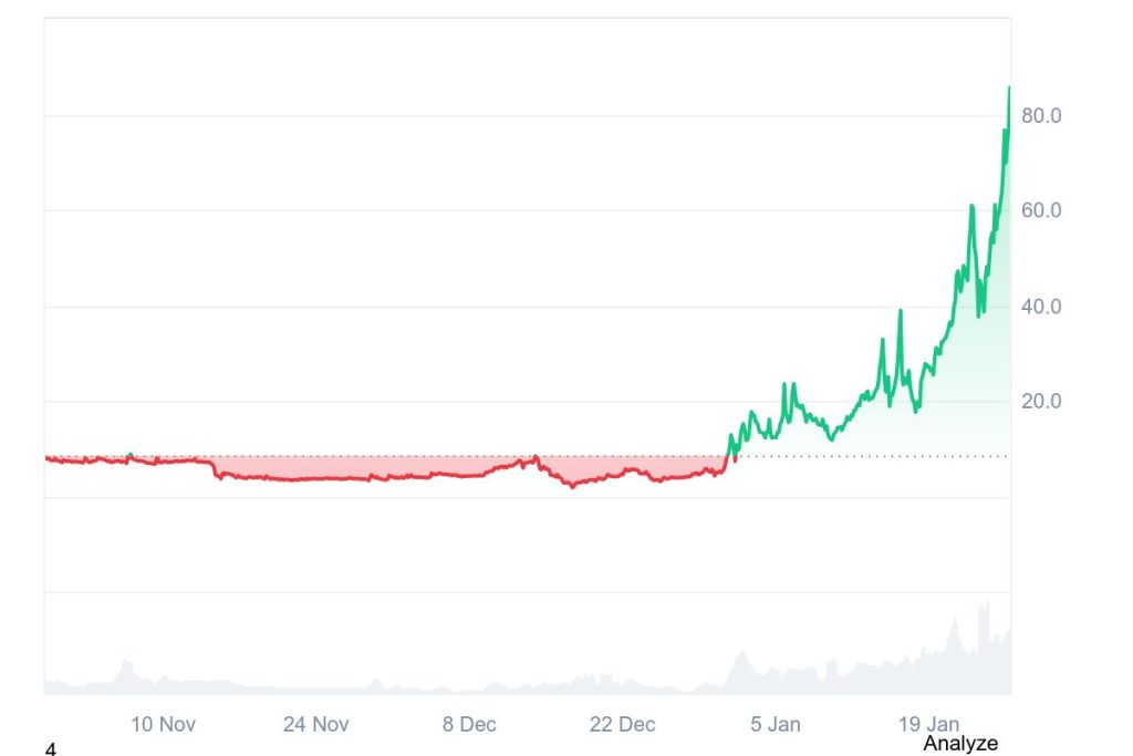 In den letzten zwei Wochen gewann die Dynamik erneut stark an Fahrt: Der Preis durchbrach mühelos die 40-, 60- und nun auch die 80-Dollar-Marke. Im Monatsvergleich steht ein Plus von 2119 Prozent zu Buche. Mit einer Marktkapitalisierung von mehr als einer Milliarde Dollar hat sich der Token auf Rang 45 der größten Kryptowährungen vorgeschoben.
