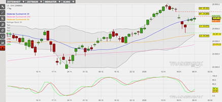 Charttechnisch konnte der DAX noch am 13. Januar auf ein Allzeithoch ausbrechen. Anschließend hat allerdings ein steigender Verkaufsdruck den Index in einer ersten Verkaufswelle bis zum lokalen Minimum am 21. Januar bei 24.344 Punkten vom lokalen Maximum bei 25.510 Punkten um 1.166 Punkte korrigieren lassen. Eine Zwischenerholung hat die Kursentwicklung an den letzten drei Tagen zum gleitenden Durchschnitt der letzten 20 Börsentage (= GD 20) geführt. Solange der gleitende Durchschnitt allerdings nicht nachhaltig überwunden wird, weist er ein Verkaufssignal aus. Eine neue Verkaufswelle könnte dadurch in den kommenden Tagen vorbereitet werden.